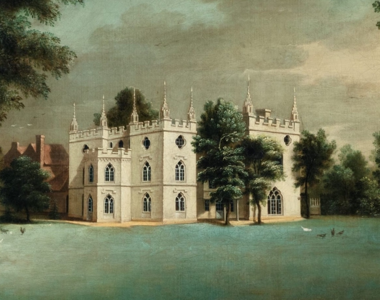 Commissioned by Horace Walpole, this is one of only two known oil paintings of Strawberry Hill and the earliest detailed painted view of the house. It captures the villa at a crucial early stage, before its most dramatic transformation in 1759 — preserving the only contemporary visual record of Walpole’s first Gothic experiment.